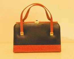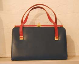 鮮やかな赤と青のコンビのハンドバッグ。写真ではわかりにくくなっていますが、落ち着いた濃紺と鮮やかな赤の組み合わせで、留め金が細かい彫りの入ったゴールドになっています。マチが広いので小ぶりですが意外にたくさん入ります。こちらも閉める時にパチンと気持ち良い音がします。全面は下方に赤の切り替えが入っていますが、後面には入っていません。内ポケットが二つ付いています。エレガントな雰囲気でおすすめです!