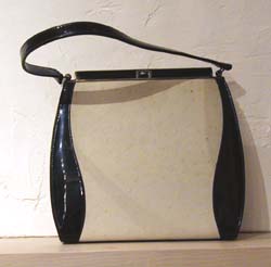 丸みのあるフォルムとモノトーンカラーがエレガントな大人の女性らしさを感じさせる、アメリカのバッグ。オーストリッチ風に型押しされたアイボリーのフェイクレザーと黒のエナメルの組み合わせがとても新鮮です! 内側は光沢のある黒いサテン地が張られています。底には鋲が付いていて、持ち手はショルダーバッグとしても使える長さです。クラシカルなスタイルにもバッドガール風にも合わせられそうな、おすすめバッグです。