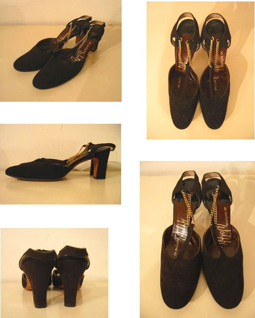 非常になめらかでヴェルベットのようなスエードを使っていて、ソールも内側もレザー張りになっています。足首周りのゴールドのチェーンがアクセントになっていて、ほっそりとした洗練されたシルエットです。ヒールがしっかりしていること、ストラップで足首が固定されていることから履き心地は大変良いです。古い時代のものですが、状態はかなり良い方だと思います。パーティー・ドレスなどフォーマルな場でのコーディネイトはもちろん、ジーンズなどカジュアルなスタイルに合わせても大人っぽく決まるシックな1足です。