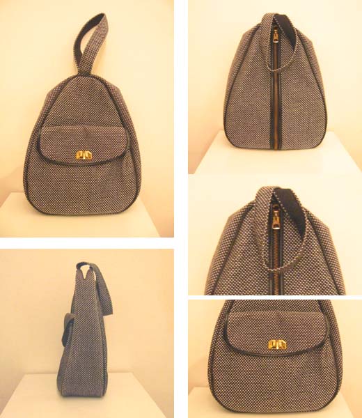 とてもしっかりしたつくりでころんとした洋梨形の形がかわいいです。ネイビーと白の糸でツイードのように編まれた堅めのしっかりした生地で、肌触りはさらっとしています。こちらは後ろの外側にゴールドの留め具のポケットが付いています。黒のレザーのトリミングと渋いゴールドのファスナーがアクセントになって全体をぐっと引き締めています。中は朱色の生地が張られています。マチもたっぷりあって、小ぶりですがたくさん入ります。デッドストックのグッド・コンディション。パンツに合わせてマリンぽくも、レトロなワンピースに合わせて60's風にも、いろんな雰囲気が楽しめそうです。