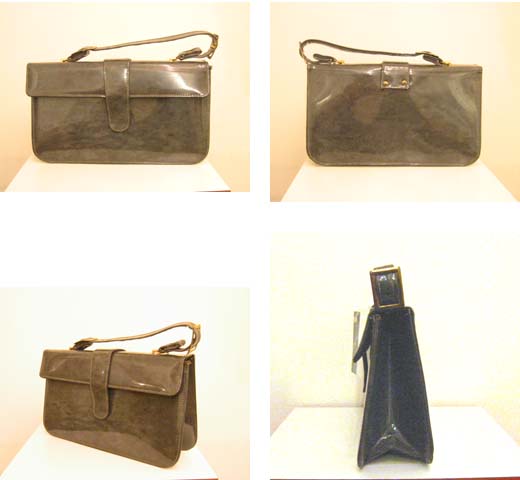 シンプルでかちっとしたデザインとマーブル・グレイのエナメルの質感がかわいいイギリスのハンド・バッグ。