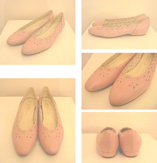 さくら貝のような淡〜いベビーピンクと波型のカッティング、花びらのような刳りぬきが甘い雰囲気のレザー・パンプス。
