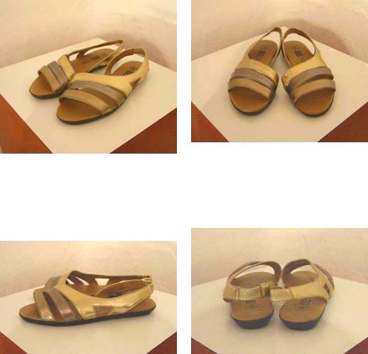 なめらかでむにっとした素材で、ブロンズ、シャンパンゴールド、イエローゴールドの微妙なグラデーションが上品です。バックストラップにゴムが入っているので足にぴったりフィットします。ヒールの無いタイプですが、すっきりしたデザインで大人っぽい雰囲気。シンプルなデザインのゴールド・サンダルは夏のお洒落のスパイスになってとても重宝します。デッドストックですので、ほぼ新品に近い状態です。
