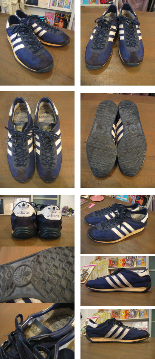 70年代に発売されたジョギングシューズです。恐らく定番モデル「カントリー」をアレンジして作られたものだと思われますが、詳細不明です。このモデルは相当レアです。この年代のアディダスはメッシュ地自体が珍しいのですが、このモデルのようにアウトソールがアッパーの色と同じというのは更に珍しく、なかなかお目にかかれません。アッパー、ソール、靴紐やシャープなシルエットなど、ヴィンテージのディテールが満載です。見ているだけでぐっときますが履くとまた更にその良さが堪能できそうです。実際のお色は写真よりもより黒に近いダーク・ネイビーになります。これを逃すとなかなか手に入らないと思いますので、さがしていた方は是非どうぞ。