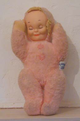 アメリカの玩具メーカー「ニッカーボッカー」社の "スリーピー・ヘッド"。ピンク色のベビー服にくるまって眠っている赤ちゃんの人形です。古い時代のものですが、当時のアメリカの人形は日本で作られたものが多く、こちらも日本製です。画像では少し汚れて見えますが、実際はもう少しきれいです。表面は水洗いできます。赤ちゃんというにはちょっと大人っぽすぎる表情が、どことなく不気味ですね。ネーミングも謎でかわいい!