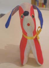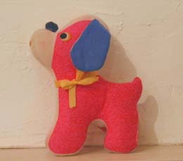 鮮やかなピンクととぼけた表情がかわいい、イギリスの犬のぬいぐるみ。横から見ると普通なのですが、正面から見るとぺしゃんこなのもいい味出しています。