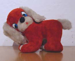 ちょっと小首をかしげて振りかえっているポーズがかわいらしい、アメリカの犬のぬいぐるみ。古い時代のものです。当時のアメリカの人形は日本で作られていたものが多く、こちらもタグにmade in japanと書かれています。ドリームペッツのような雰囲気で硬くずっしりしています。ぬいぐるみをたくさん並べた先頭に置きたい子ですね♪