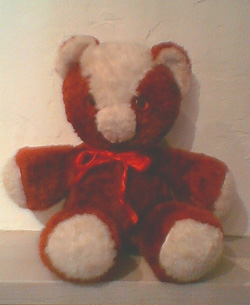 タグの端がきれてしまって読み取れないのですが、N.Y.の'〜llcraft Nov. Co.'という会社のもので、顔つきや質感から古い時代のものだと思われます。瞳孔の開いたプラスチックの瞳の無表情さが逆に愛らしいです。表地はセルロースという光沢のある柔らかな天然素材で、赤ちゃんの肌着などにも使われる、人にも環境にも優しい繊維です。レンガ色とアイボリーの色合いも温かみがありますね。