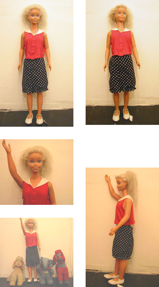 身長96cmなので小学一年生くらいでしょうか? ふわふわポニーテールのプラチナ・ブロンドにほんのり日焼けした肌、淡い水色の瞳には星がいくつも輝いていて、正統派アメリカン・ビューティーを一身に体現しています。両手両足が好きな角度に動かせるようになっていて、いろんなポーズができるのが楽しいです。靴はオリジナルですが、残念ながらお洋服は当時のものがありませんので今の子供服を着せてあげています。お洋服でずいぶん雰囲気が変わりそうですね。着せ替え遊びでお洒落に変身させてあげてください♪ その大きさと存在感でどんなぬいぐるみたちの中に入ってもすぐリーダーになってしまいそうな人です。