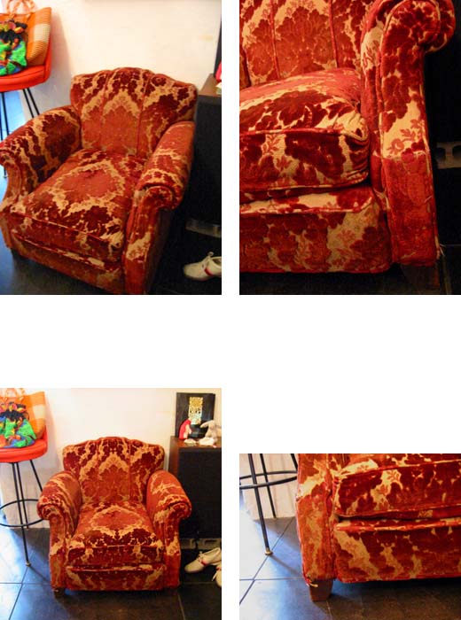ロココ風?の優美な流線型のボディに木製の脚が付いています。クロスは毛足の短いベルベットで、くすんだクリーム色にボルドーの植物柄で大変高級感があります。スプリングの効いたクッションで座り心地も大変良いです。ところどころクロスに擦れ跡、ほつれが見られますが、素材の特質上それほど目立つ感じではないと思います。デザイン、座り心地共にラグジュアリーな雰囲気たっぷりですが、どことなくかわいらしい感じも? どんなお部屋にも意外にしっくり馴染みそうなソファです。