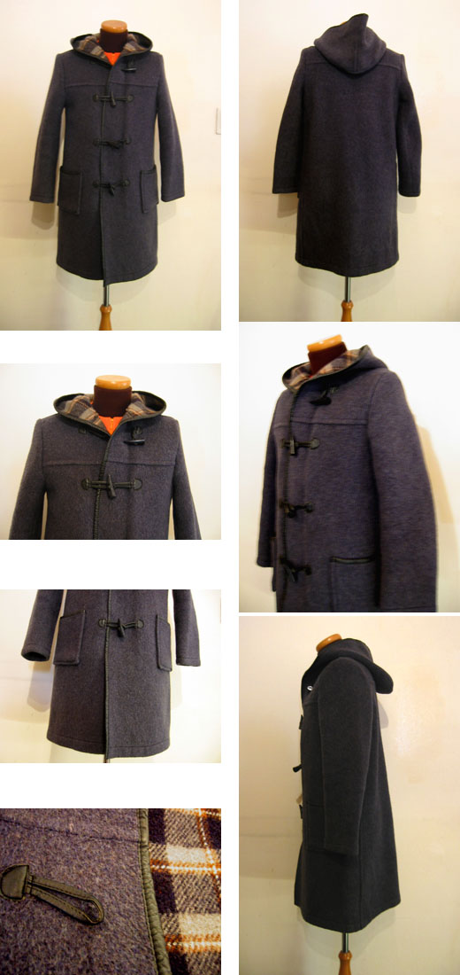 黒に近いチャコール・グレーの圧縮フェルト地で、裏地はネイビー、アイボリー、ブラウンのチェック柄になっています。フードからフロントにかけて、ポケットの縁に黒のレザーのパイピングが施されていて、とても凝ったつくりです。仕立ての良いタイトなダッフルはヨーロピアン・トラッドの代表格ですが、どことなくロックな雰囲気も漂ってかっこよいですね。コンパクトなサイズですので、女性の方もOKです。これ一枚で真冬も十分にあったか、一枚は持っていたいアイテムです♪