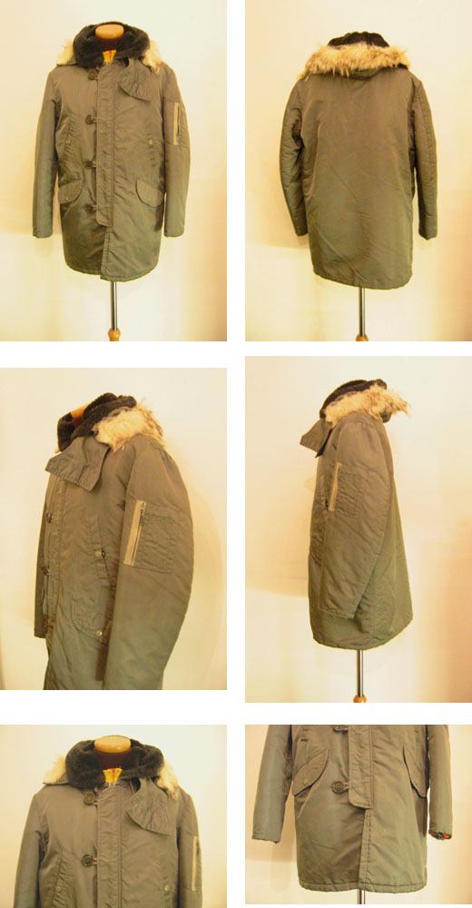 淡いきれいなオリーブ色が上品で、裏地はオレンジのキルティングになっています。カーキのボアとファー付きのフード、大きなチン・ストラップも付いています。かなり小さめですので女の子が着てもいい感じです。フロントの生地に薄い汚れが点々と付いていますがそれほど目立つ感じではないと思います。