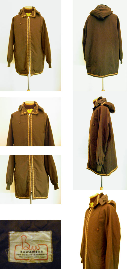 イギリスらしい渋いこげ茶色のコットン地で、マロンブラウンのチロリアン・リボンの縁飾りが北欧風です。裏地がこげ茶のキルティングになっていて、袖口がリブになっているので軽いですがとても暖か。フードは取り外しもできます。両サイドに縦ポケット付き。ラグランスリーブの細身のシルエットで、深みのある色合いとあいまってシャープな印象です。おすすめです。