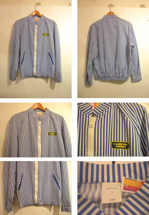白にブルーのストライプが爽やかで、小さなスタンドカラー、両ポケットのブルーのパイピング、プラスチックの白いジッパーなどディテールも上品です。胸元にはダークネイビーとレモンイエローで"Ladbroke