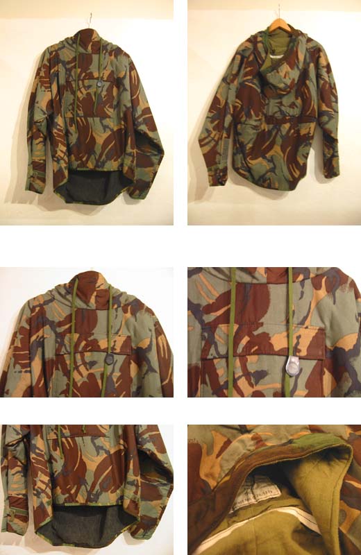 迷彩の柄や色合い、シルエット、素材共にかなり渋い1枚。少し光沢のある柔らかな表地に、麻袋のような黒い裏地が付いていて、フード裏はコットンのとてもしっかりした作りです。軍物のプロテクト・スーツなので軽くて暖か、ある程度の雨は防いでくれます。袖口と裾はマジックテープで幅を調節でき、フードはフィンランド製Fixlock社のホルダーで紐の長さを調節できたりとディテールも凝っています。フロントには特大のフラップ・ポケットが付いています。なんといってもヨーロッパらしいきれいな色合いのポロック風カモフラージュ柄がクール、フードの立ち具合も着るととてもかっこよいシルエットになります。わりと大きめの作りですが、ラグランスリーブになっていますので小柄な方がたっぽり着ても良い感じでおすすめです。