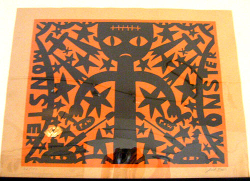 そのスペイスモスでの個展の際に展示されたものでゴールドがかったれんが色に黒のシルクスクリーンで彼の切り絵をもとにした絵柄(フランケンシュタインのようにもみえますね)がプリントされています。65cm×45cmと大判なのでポスターとしても楽しめてインパクト大。右下にはジャドのサイン入り。枚数限定のレアなアイテムです。