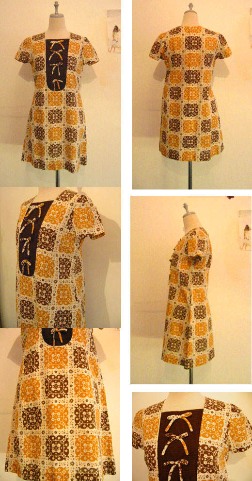 こちらもとてもキュート。小さな肩にパフスリーブ気味のフレンチスリーブ、細身のAラインが60年代らしいシルエットです。北欧のファブリックのような花柄がガーリィーですが色合いが落ち着いたブラウン系で甘さ抑えめです。共布のリボンが付いた胸元のU字の切り替えは60年代のカルダンやクレージュのデザインを彷彿とさせます。そのままミニ丈でニットタイツやブーツに合わせたり、パンツと合わせてチュニック風に着てもすてきです。映画"女性上位時代"でミミ(カトリーヌ・スパーク)が着ていそうなコケティッシュなワンピース♪