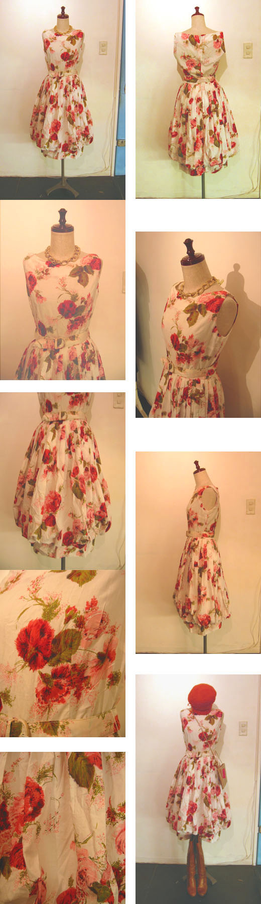 うーん、こちらは本当に素晴らしいです! 生地や仕立ての美しさが写真ではよくでていないのが残念なのですが・・・ さらっとしたアイボリーのコットン地にフューシャピンクとモスグリーンなどで水彩+ペン画のような繊細で大胆なタッチの植物模様(バラとカーネーション?)が入っていて、まずファブリックの美しさにうっとりします。そしてなんといっても優雅で珍しいスカートのシルエット! コンパクトなトップスと、きれいに折りたたまれたプリーツがたっぷりととバルーン状に広がるスカートのバランスがとても華やかでコケティッシュです。裾をすぼませるため、すとんとタイトな裾が覗いているのが、今のモードのバルーン・シルエットと一線を画していて非常にエレガントでクラシカル。逆に新鮮かもしれません! バルーンの膨らみも抑えめで、甘すぎないシルエットと柄がクールです。スカート部分にうっすらとしみがありますが、ほとんど目立たない程度かと思います。映画"マリー・アントワネット"に出てきそうな大人ガーリィーな1枚、おすすめです♪