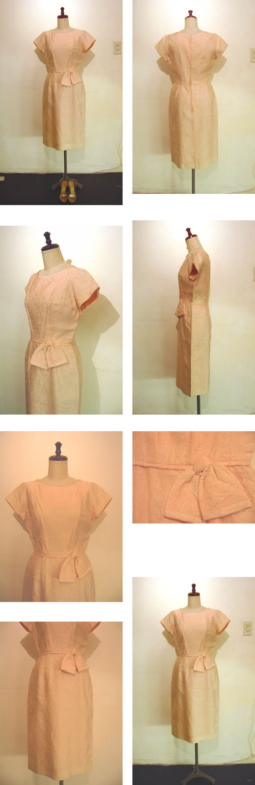 細く横畝の入ったシャリ感のあるしっかりしたサテン地に、ちりめん状のエンボス加工でバラのような植物柄が型押しされた素材で、淡く発光するようなベビー・ピンクが甘く上品な雰囲気。襟元とウエストはパイピングが入っていて、サイドの大きなリボンがアクセント。フレンチスリーブにほっそりしたIラインシルエットが50年代のエレガントな雰囲気を伝えています。さくら色の裏地が付いています。フロントとバック、スカートに薄い汚れがありますが、あまり目立つ感じではないかと思います。ファー・ケープやクラッチバッグなどを合わせてエレガントな50's女優風コーディネイト、三つ折ソックスにオープントゥ・パンプスでグッドガール風などいろんな雰囲気が楽しめるワンピースでおすすめです。
