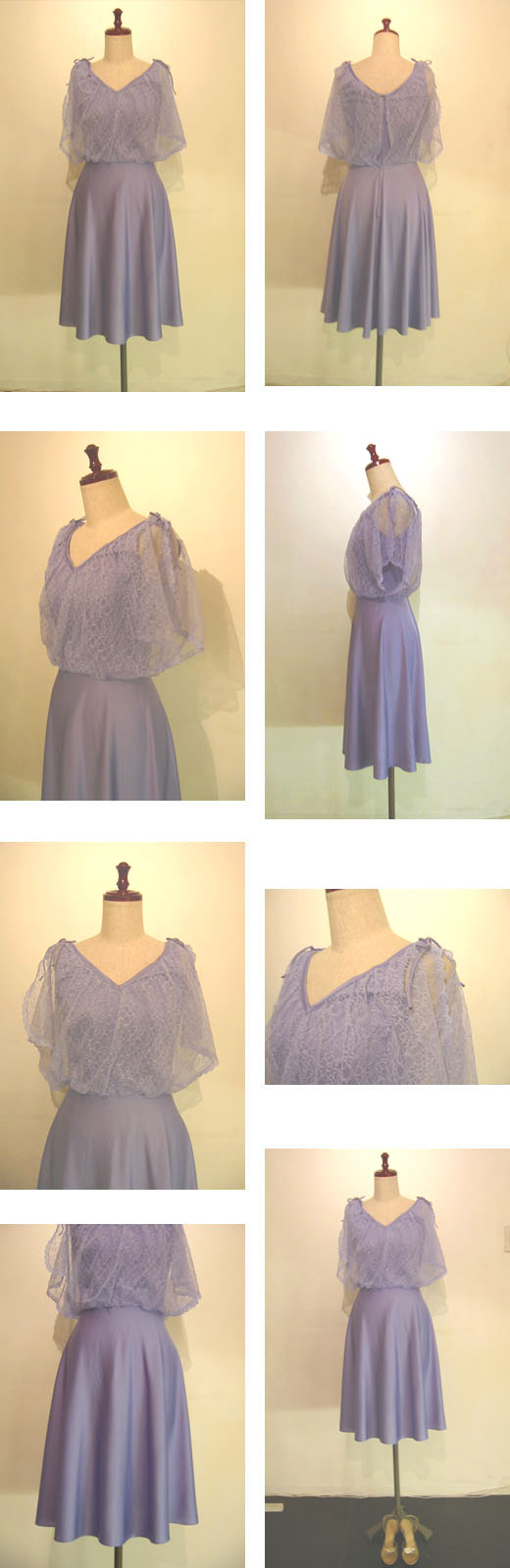 ふんわりつるりとしたサテン地に、淡い藤色がほどよく甘く、なんとも上品な雰囲気です。トップスは前後が深くVに開いたコンパクトなノースリーブで、その上にお花模様の刺繍が入ったレース地がふんわりとかぶせられています。くものような小さな波型にカットされたレース地の裾は花びらのよう。フレンチ〜バタフライスリーブのようなシルエットのドレープが大変きれいです。そして肩先にはサテンの丸紐がついていてリボン結びができるという細やかさがたまりません。ぴったりとフィットするウエストから優雅なドレープのフレアー・スカートに繋がって、体のラインをきれいに見せてくれます。着る人をぐっと引き立たせる、華やかな場にぴったりのドレス、とてもおすすめです!