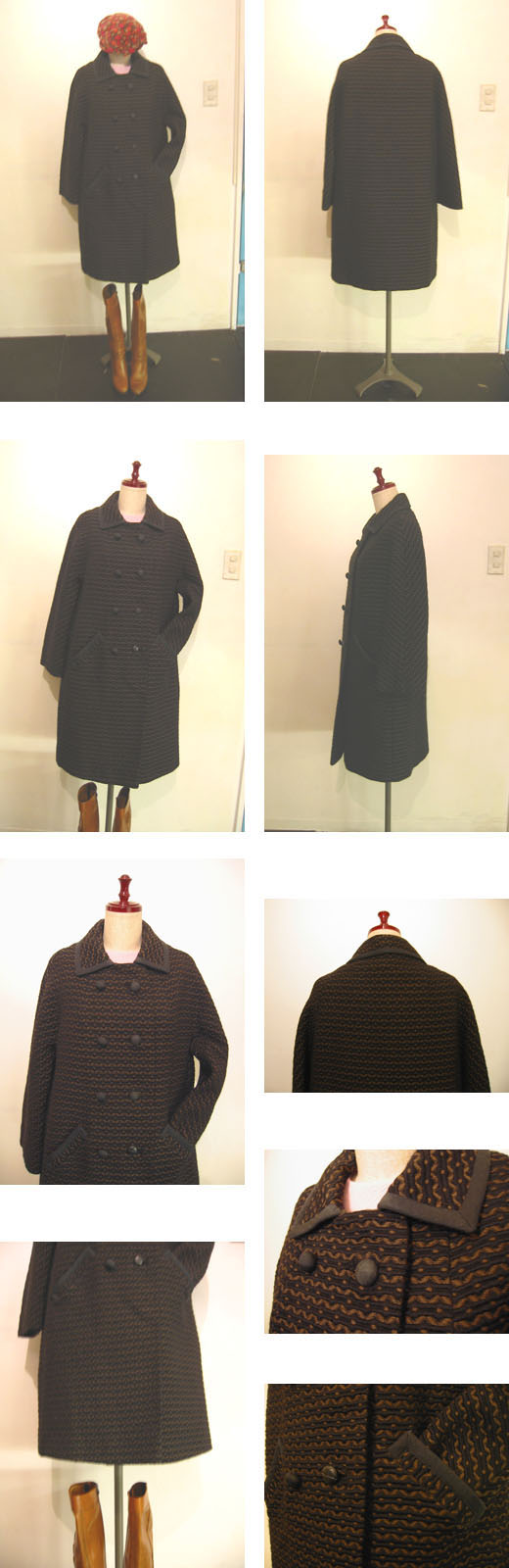 肉厚のウール地に黒とブラウンの波型の刺繍が施された生地は見た目より軽い着心地で、張りのある優雅なシルエットを作ってくれます。ラベンダー色のサテンの裏地が付いています。光沢のある布でくるまれた真ん丸いボタンも60年代のクチュール感たっぷり。一番下のボタンが1つ欠けていて、似た雰囲気のくるみボタンに変えてあります。グラフィカルなパターンのモノトーン柄がクールで、"ポリーマグーお前は誰だ?"に出てきそうなモッドなコート。ボタンの欠け以外はコンディションも大変良いです。