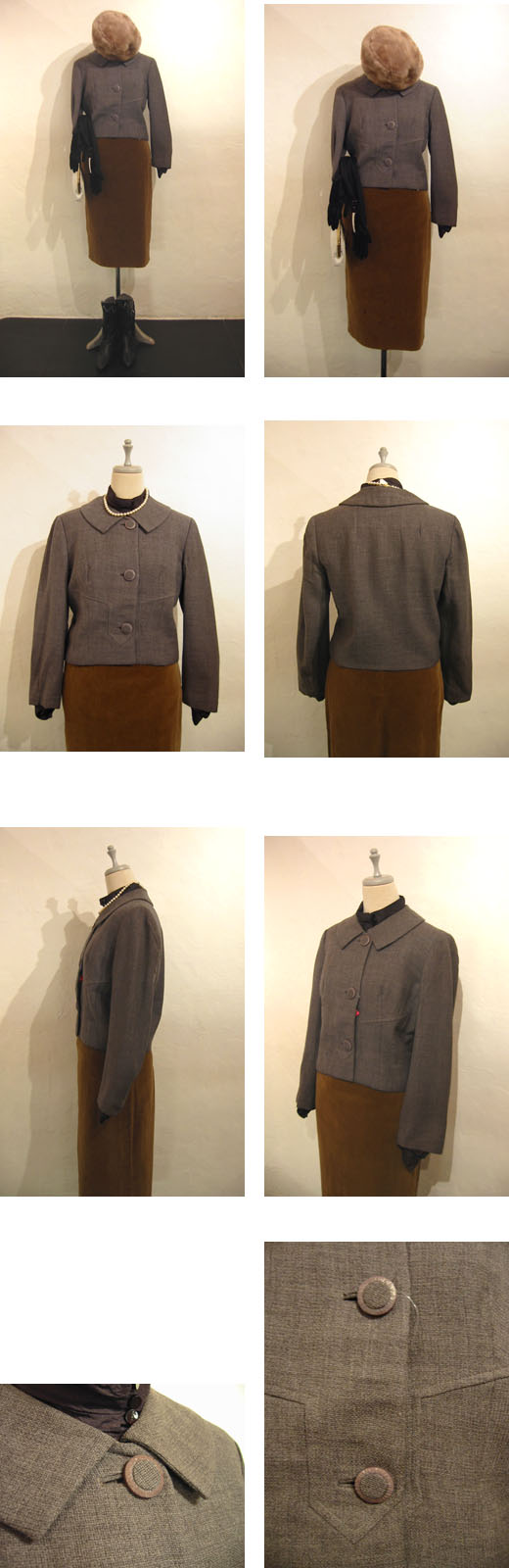 軽くさらりとしたツイード地で、生地も仕立ても非常に高級感があります。落ち着いたグレーがシックで大人っぽい雰囲気。フロントの幾何学的な切り替え、彫りの入ったパープルがかったオールドプラスチックに共布が埋め込まれたボタンなど、ディテールまで手が込んでいます。コンパクトなシルエットのショート・ジャケットはパンツにもスカートにもバランスよく合わせられて重宝しそう。コンディションも良好です。