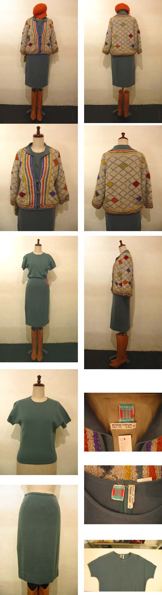 イタリアのハイゲージ・ニットは肌触りが良く体に柔らかくフィットするので、60年代のジャケットやワンピースなどによく使われていました。発色の繊細な美しさもイタリアン・ニットの魅力です。こちらは背中をファスナーで開けるシンプルな丸首ニットとほっそりした膝丈スカート、3つボタンジャケットの3点セットです。ジャケットは淡いオリーブグリーンのハイゲージニットのベースに、もこもこと小さなパイル状に編まれたニットが重ねられています。小さな襟、シルバーメタルとニットを組み合わせたまん丸いボタンがかわいらしいです。パイル部分はアイボリーに淡いパープル、オレンジ、グリーン、やまぶきのライン、モンドリアン風のチェック柄がなんともすてき。セットアップはもちろん、どれも1点ずつでも使いやすくていろいろ楽しめるアンサンブル、おすすめです!