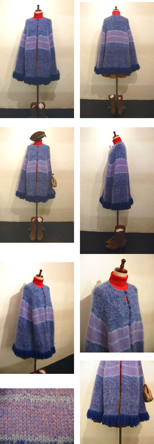 ロイヤルブルーの霜降りが鮮やかで上品な雰囲気、胸下の辺りが淡いパープルとピンクのボーダーになっています。フロントのボタンもニットで包まれていて、裾は毛糸の房飾りが付いています。小さな肩からゆるやかなドレープ状にフレアーが入った形ですっきりきれいなシルエットになります。ポンチョ型のアウターはたっぷりした袖のニットやジャケットの上からも羽織れて便利です。コンディションも良好でおすすめです。
