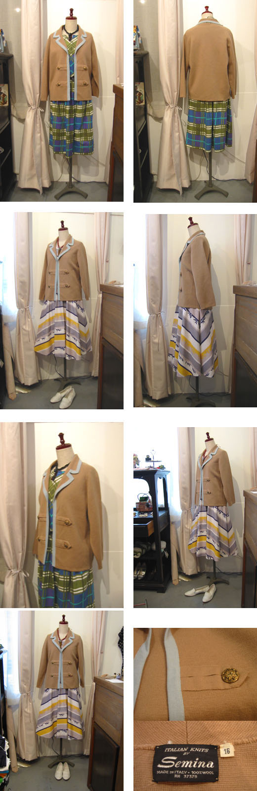 とても目の細かなニットジャージ素材で、落ち着いたベージュに淡いミントグリーンのトリミングがとても上品でほんのり甘い雰囲気。彫りの入った渋いゴールドの飾りボタンが二つずつ並んでいて、全体をシックな印象にしています。体に柔らかく馴染むシルエットのニット・ジャケットは、カーディガンとジャケットのあいだの感覚で羽織りやすく、一枚あるととても重宝します。写真のようにワンピースやスカートに合わせてクラシカルな雰囲気にも、パンツに合わせてトラッドな雰囲気にも、いろんな表情が楽しめそうです。ウール100%ですがさらりとした肌触りで軽いので、初夏や秋口の羽織ものとしても、大変おすすめの1枚です。